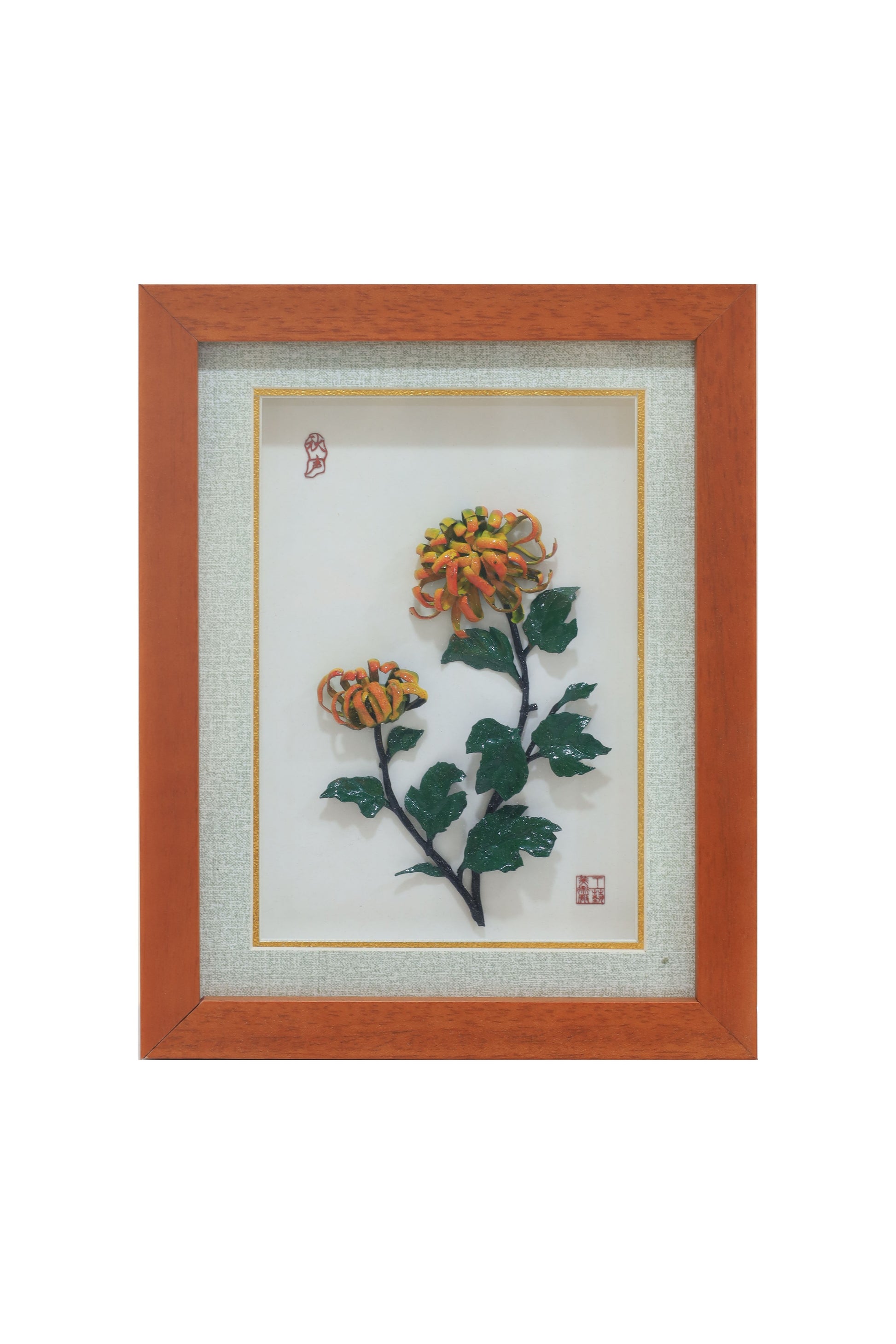 With its small size (21 × 27 cm), this artwork is ideal for cozy wall spaces, desks, shelves or bedside tables. It adds a refined touch of Chinese chrysanthemum wall art and subtle Asian home décor to modern interiors, and pairs easily with other metal wall art or framed prints.