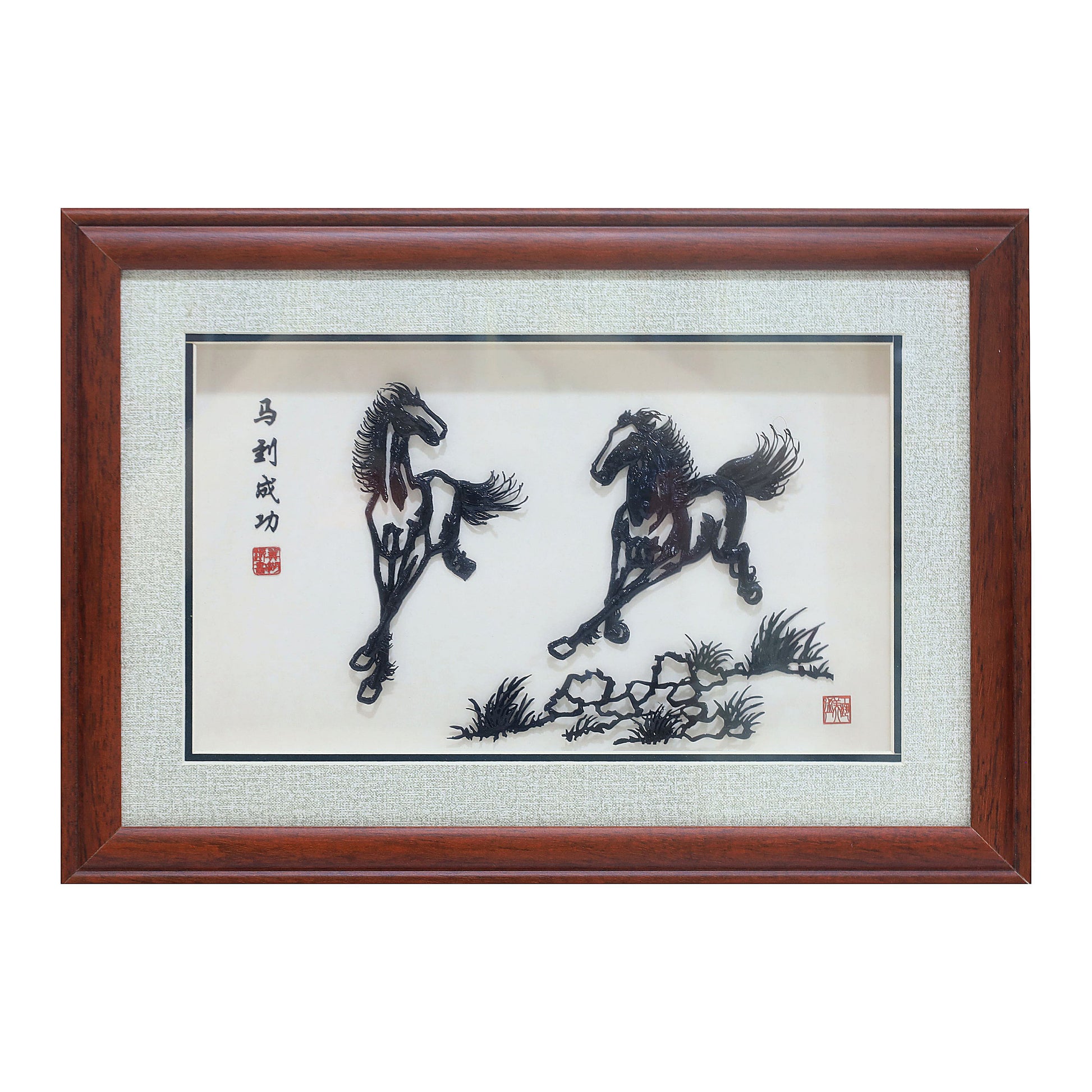 “Horses of Swift Success” is a mini Wuhu iron painting featuring two spirited horses galloping across rocky ground. Their flowing manes and raised hooves are forged from iron in bold, calligraphic lines, echoing the energy of traditional ink horse paintings but rendered in three-dimensional metal relief.
