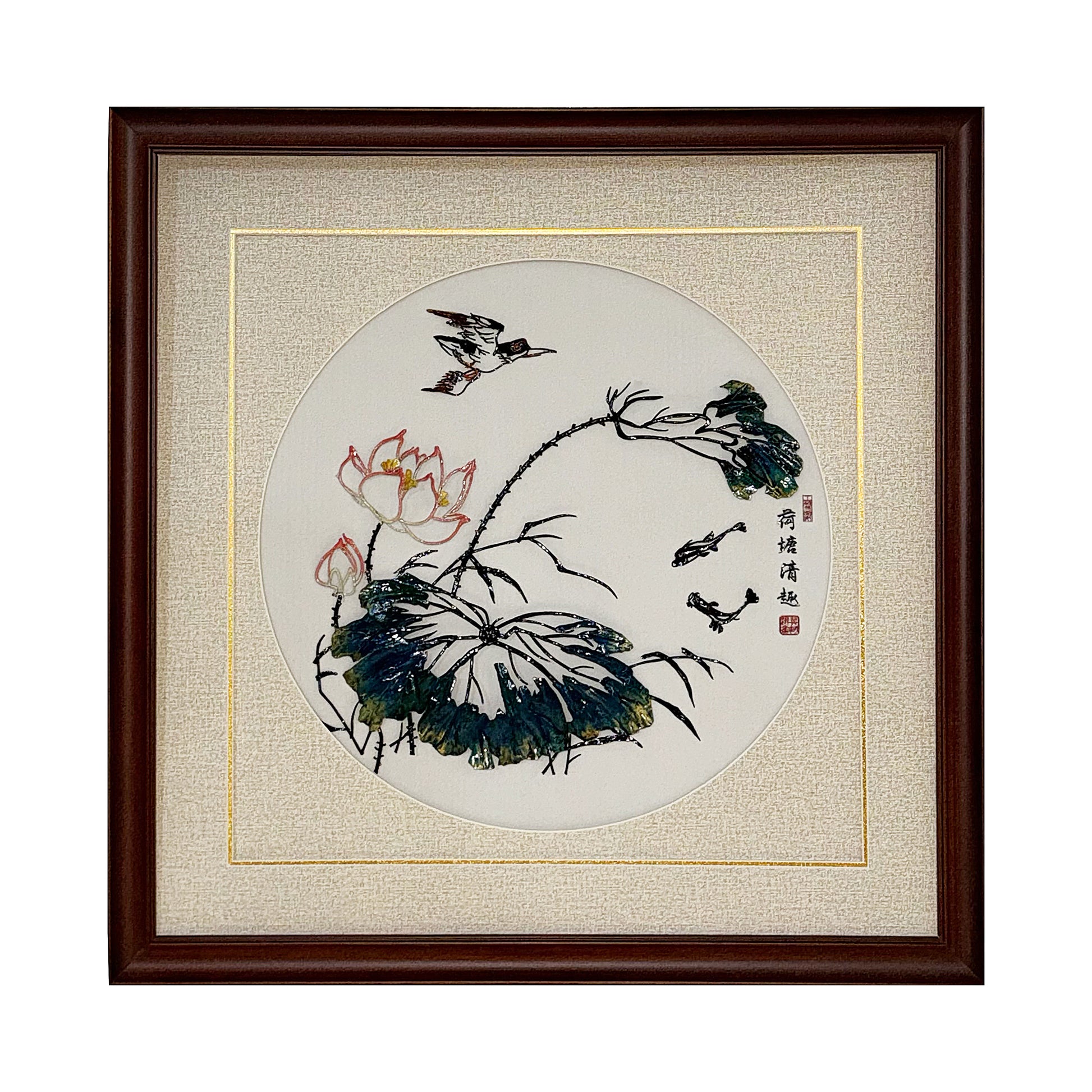 “Lotus Pond by Moonlight” is a round Wuhu iron painting that portrays a quiet lotus pond under soft, imagined moonlight. Hand-forged iron outlines the graceful lotus stems, broad leaves and lively fish, while subtle colors are applied to the blossoms and foliage to echo the feeling of an ink-and-wash painting. A small bird in flight adds movement to the calm scene, and the circular panel (65 × 65 cm) itself recalls the shape of a full moon.
