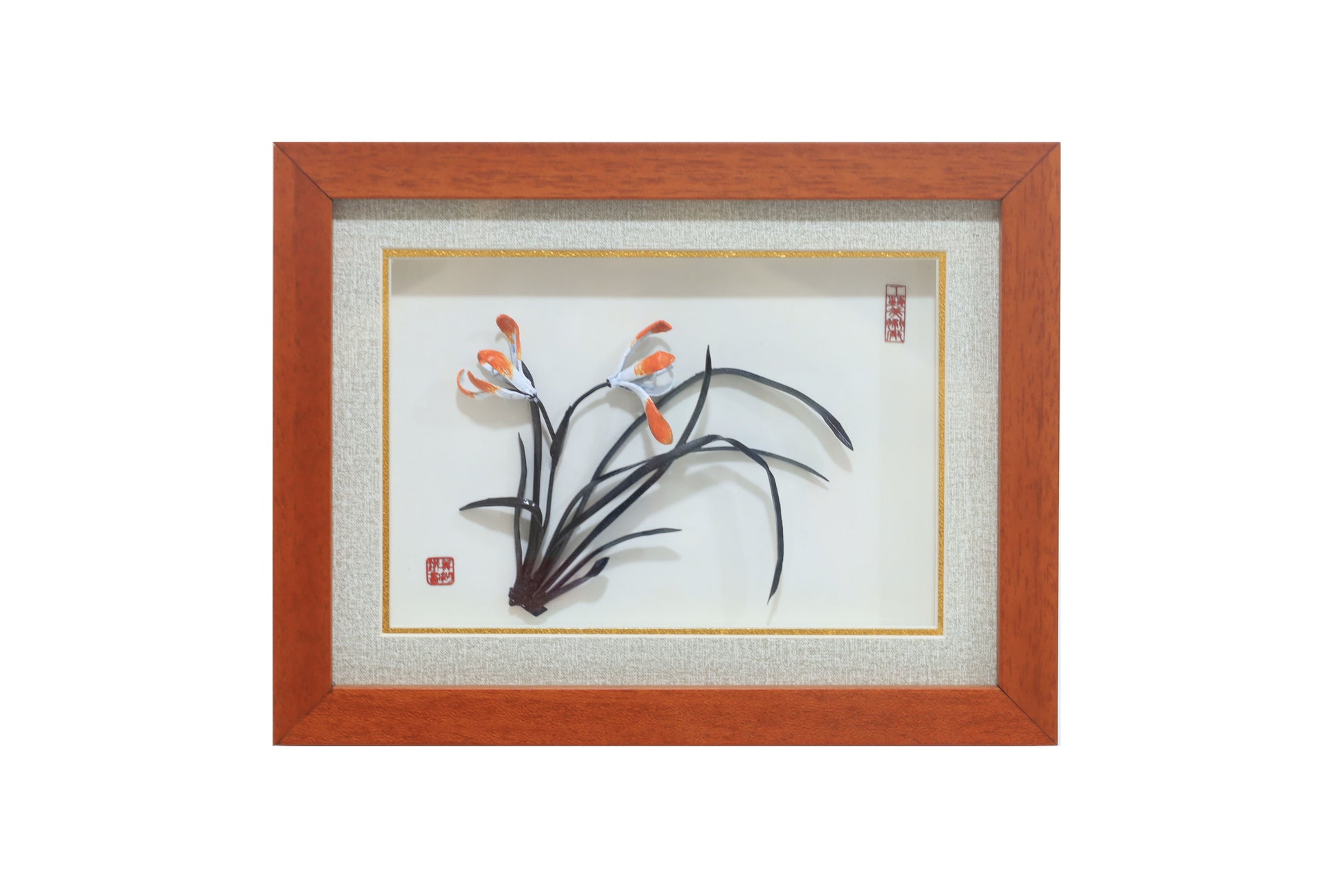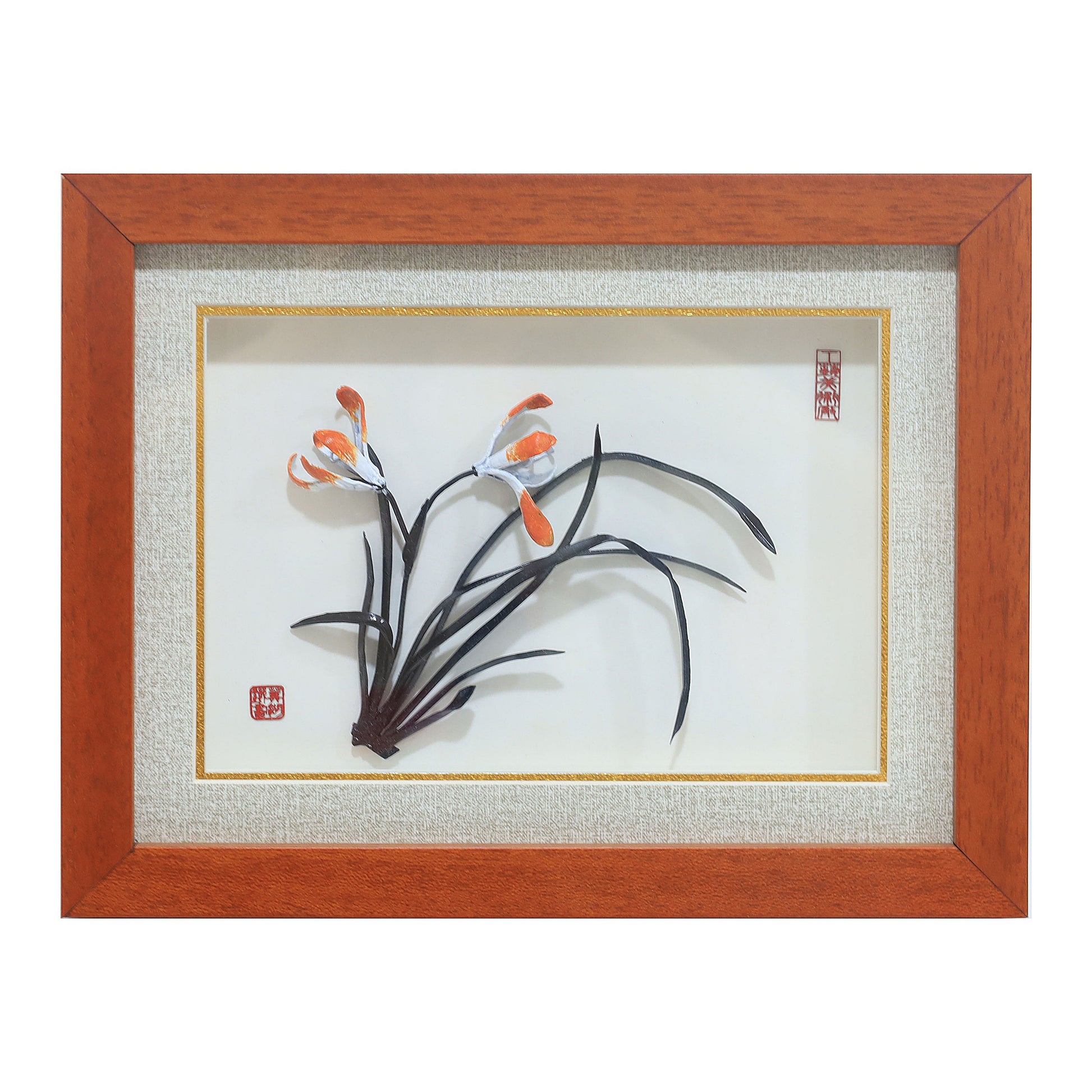 “Orchid in Quiet Bloom” is a small Wuhu iron painting that captures a simple spray of orchid grass with slender leaves and orange-tipped blossoms. Each leaf and petal is forged by hand from iron, then gently curved away from the background so it casts soft shadows, echoing the feel of a traditional ink painting in three-dimensional metal.